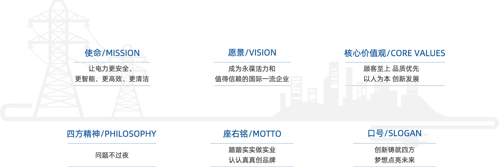 公司始终以“让电力更安全、更智能、更高效、更清洁”为使命,坚持技术引领、创新发展理念,致力于成为永葆活力和值得信赖的国际一流企业。
